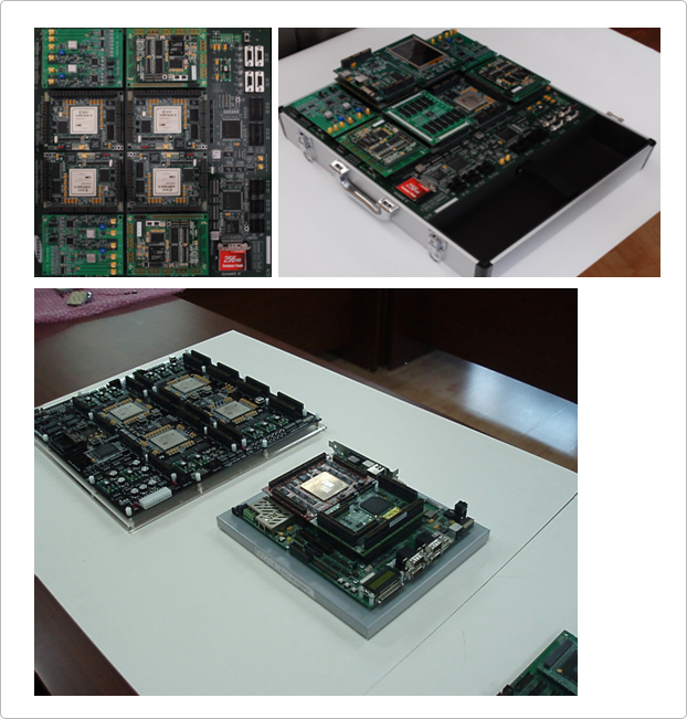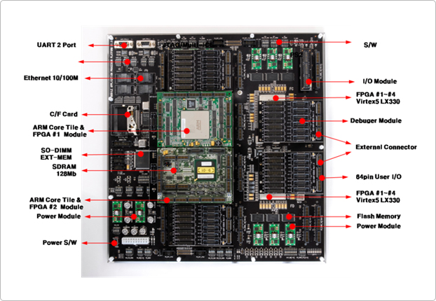 The MFP-LX760-Q is also interfaced with ARM926/1136/1156/1176/MPCore Core Tile (AHB and compressed AXI bus). The MFP-LX760-Q can be used for HW/SW Co-design and Rapid Prototyping System Cores such as MPEG4, H.264, Audio Code 97, CMOS Image Sensor, Color TFT LCD, USB 2.0, and more, as well as debugging and emulating.
