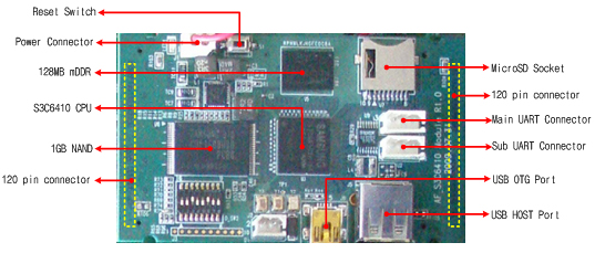 A. S3C6410 CPU B. 128MB mDDR, 1GB NAND, MicroSD Socket C. USB HOST 1port, OTG 1port UART 2port D. 229 GPIO available (2*120pin connectors) E. Connectors are compatible for MFP Series and RPS Series | ||